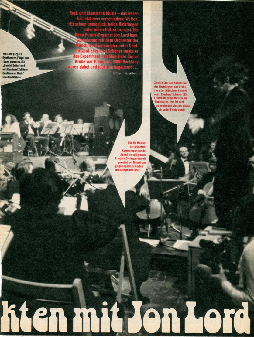 Michael hat schon recht! Es gab verschiedene Auffuehrungen der Gemini Suite, von denen zwei offiziell veröffentlicht wurden: -die eine mit Deep Purple und dazu noch diese: -Jon Lord - Gemini Suite [lp] : Germany 1972 EMI/Purple Records 1c062-92817 mit Tony Ashton (vcl); Yvonne Elliman (vcl); Roger Glover (bss); Albert Lee (gtr); Jon Lord (org/pno/kbr); Ian Paice (drm); the London Symphony Orchestra conducted by Malcolm Arnold. Diese wurde irgendwann 1971 aufgenommen (auch eine Studioaufnahme, glaube ich) Im Oktober 1973 gab es noch eine Auffuehrung mit Eberhard Schöner in Muenchen (noch vor der Windows-Geschichte). Wenn ich richtig informiert bin, wurden auch damals Filmaufnahmen gemacht. Ob es Bootlegs davon gibt, weiss ich allerdings nicht...