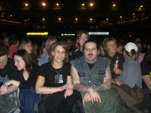 Aber nun mal von vorne: Mein Mann und ich waren - wie immer - früh angereist, und hatten uns schon gegen 11 Uhr vor dem Eingang der Schleyer-Halle "postiert". Irgendjemand hatte das in der Vergangenheit in einem anderen Fan-Forum mal so ausgedrückt: "Als wir ankamen, waren Sigrid und Andreas, wie immer, bereits seit Stunden fest mit dem Eingang verwachsen." :lolflag: Aber Wurzeln geschlagen hatten wir nun doch nicht, so daß wir bei Einlaß den Spurt in die 1. Reihe antreten konnten. Dieses Ziel haben wir dann auch erreicht. Ein freundlicher Mensch von der Security hat dann auch auf unsere Bitte hin mit unserer Kamera das "Beweis-Foto" geschossen (siehe unten). Den frisch aufgetauten Roger habe ich auch direkt mal "angehängt".