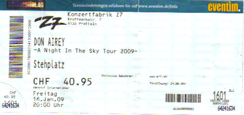 Also gegen 14:30 bestieg ich den ICE in Frankfurt am Main. Typisch für die Deutsche Bahn, machten wir im Raum Aachen 1 Stunde Verspätung. Ich hatte Angst dass ich kein Platz mehr in der ersten Reihe bekommen würde. Also gegen 19 Uhr kam ich in Basel SBB an. Fuhr mit der Bahn nach Pratteln und mit dem Taxi ins Hotel. Nach dem Einchecken lief ich im Eiltempo zur Konzerthalle.