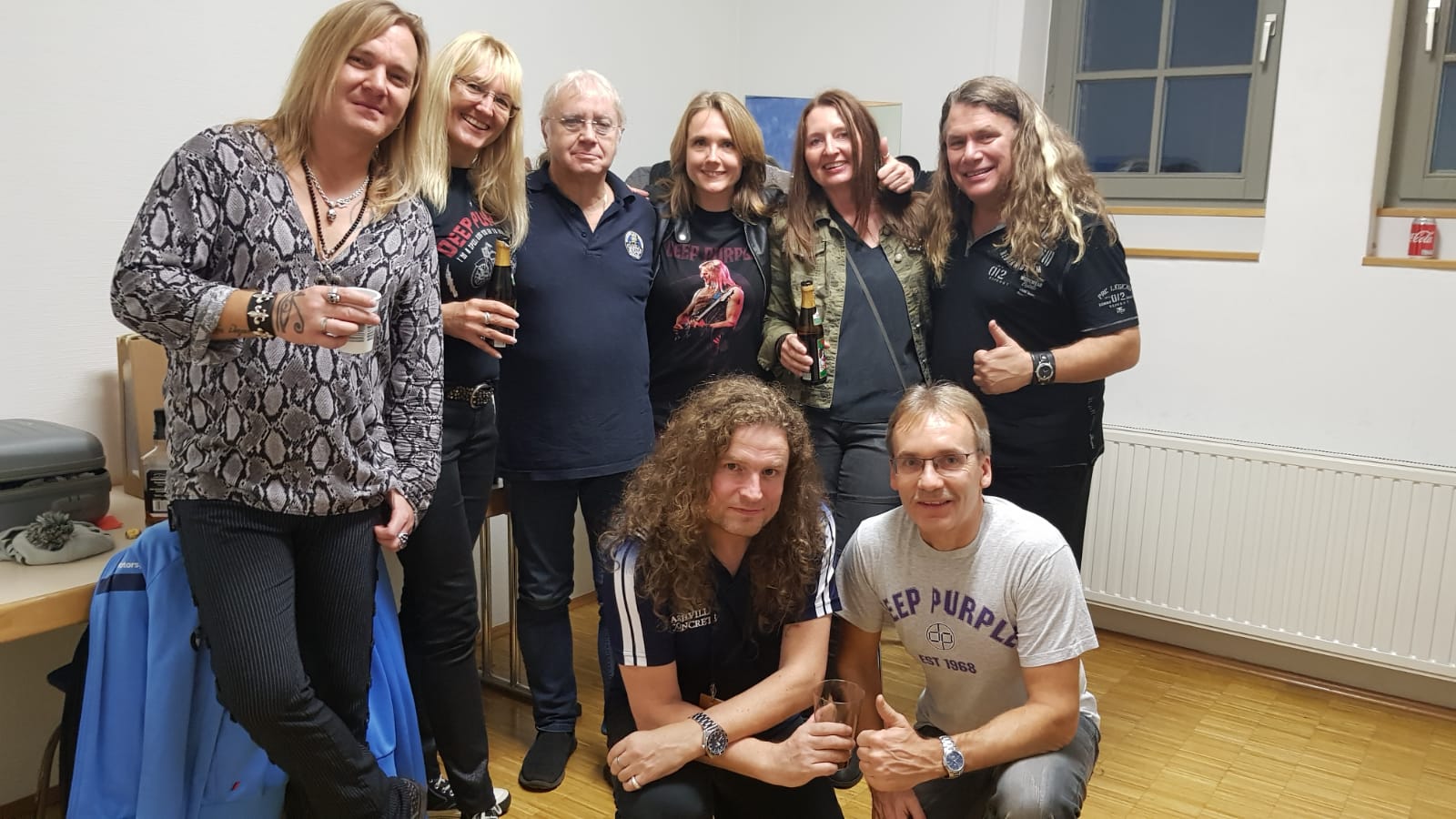 Nachdem wir geduldig den Hinterausgang angesteuert hatten wurden wir von den Ordnern nach Konzertende wieder in die Halle und direkt zu den Umkleidekabinen geführt: großes Hallo mit allen Purpendicular-Musikern - klar, wenn man 3 langhaarige Damen dabei hat (was sich jetzt irgendwie "frauenfeindlich" anhört, ich bitte dies zu entschuldigen;). Aber wo ist Paicey? "Er sitzt im Nebenzimmer, nein er schläft noch nicht, ihr könnt ruhig reingehen..." Na dann aber Stift und Foto gezückt, Ian schaut hinter einem kleinen Bildschirm hervor: Nein, wir stören ihn nicht. Er schaut sich nur die Zusammenfassung von Championsleague-Spiel: Chelsea gegen Ajax an. Aber eigentlich sei er ja Nottingham Forrest-Fän. Erfreut gibt er mir noch ein paar wenige Autogramme auf von mir mitgebrachten auserwählten Schätzchen und posed (schreibt man das so?) für uns in wechselnden Umarmungen. Wir halten uns kurz mit unserem Dank und lassen ihn das Spiel zu Ende sehen. Ziemlich schnell wird er dann aber vom ausgelassenen Lärm aus dem Bänd-Buffet-Zimmer zu uns rüber getrieben, wo er in bester Laune für weitere Gespräche und Bierchen nur unserem kleinen Kreis zur Verfügung steht. Über den mitgebrachten Schönbrunner Cuvee-Rotwein etikettiert mit Namen "Deep Purple" (16 Euro/Liter) hat er sich natürlich ganz besonders erfreut.