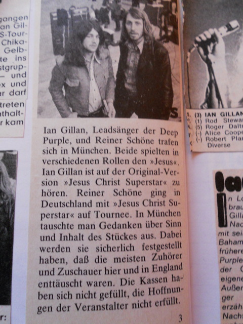 Liebe Freunde, in der Zeitschrift 'Eclipsed' las ich, daß Ian Gillan die Hauptrolle in Andrew Lloyd Webbers "Jesus Christ Superstar" gespielt hat. Das war mir nun neu. Kann mir jemand darüber etwas mehr erzählen (wie lange er das gemacht hat, wann wo...)? Wenn ja, gibt es irgendwo eine Aufnahme davon? Danke Euch im voraus Ripley