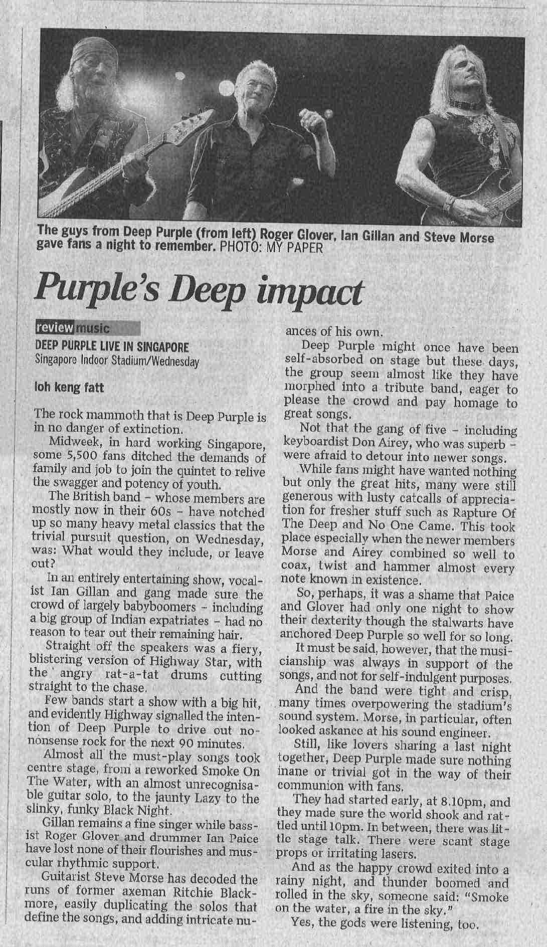 Die Halle hat eine Kapazität von ca 4500 gehabt und ich denke es waren ca 3900 Konzert-willige da. Aus den ersten geführten Gesprächen habe ich dann relativ bald herausgehört, es gibt keinen opener. Angekündigt war purple für 2000. Um 2009 ging das Licht aus und vom Band ertönte das bekannte Intro von Romeo und Julia. Die Menge liess sich davon auch gut begeistern und als purple um 2011 auf die Bühne kam, mit Highway Star loslegten, war die „Festung“ Singapore Indoor Stadium wie im Fluge genommen. Die Masse erfreute sich an dem opener, der gut einheizte. Interessant war es dann zu beobachten, wie sich die grosse Masse bei den neuen Stücken verhielt. Für Singapore genauso wie für den Rest in Asien, sowie Australien, sind ja die Stücke von Rapture of the deep absolutes Neuland. So haben sich auch viele eher reserviert verhalten. Bei den Klassikern wurde dagegen sofort mit eingestimmt, wobei es allerdings schon eine Grundzurückhaltung hier gibt. Sehr interessant war die Zusammensetzung des Publikums. Es gab da Rockfans, die sich auch durch Kleidung und äusseres zu der Leidenschaft bekannten. Aber genauso waren Frauen in Miniröcken, Abendkleidern , hohen Absätzen oder, das andere „extrem“, mit Kopftuch zu sehen. Es gab aber auch viele Besucher, die aus europäischen oder amerikanischen Ländern kommen und hier beruflich zu tun haben/Leben.