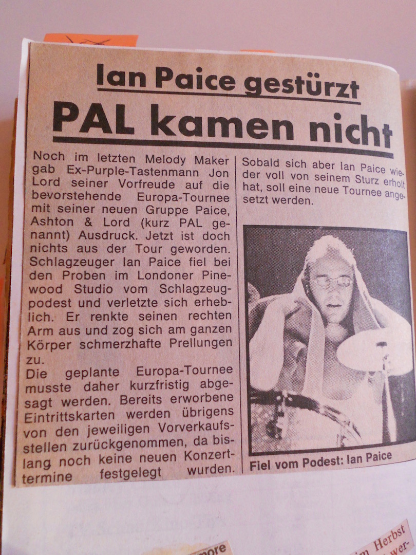 Mit dieser Falschmeldung (schätze vom Management) hat Bernie in seinem Buch gründlich aufgeräumt. Paicey ist keineswegs gestürzt. Die Tour wurde ganz einfach wegen miserablem Vorverkauf abgesagt, die Platte war ein Flop. Für Jon und Ian war das natürlich eine völlig neue Erfahrung.