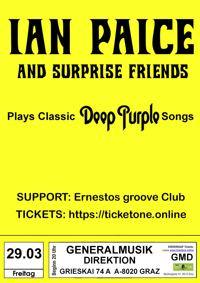 IAN PAICE KOMMT AM 29.3.2019 nach Graz in die GENERALMUSIKDIREKTION Grieskai 74a8020 Graz. Es ist der selbe Veranstalter der IAN PAICE AND FRIENDS 2018 in Frohnleiten veranstaltet hat.