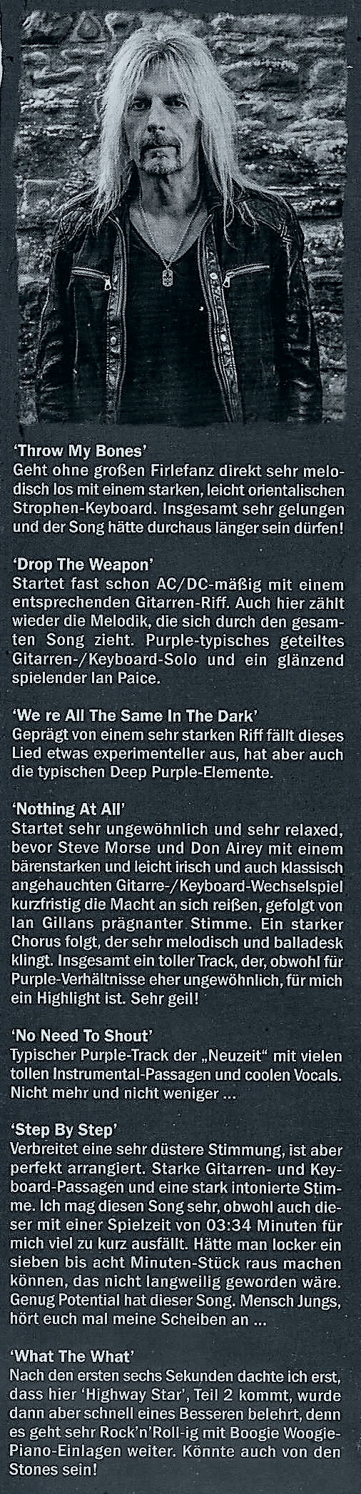 Hier noch eine weitere Album-Rezension, die schon etwa zwei Monate zurückliegt. Sie stammt von Axel Rudi Pell und wurde in der Zeitschrift "Rock it" Mai/Juni 2020 (Titelgeschichte: Deep Purple - Das letzte Kapitel?") veröffentlicht. Weil es hier die 1 MB-Grenze gibt, musste ich die Rezension ein wenig merkwürdig zerstückeln. Rock on! nainallig